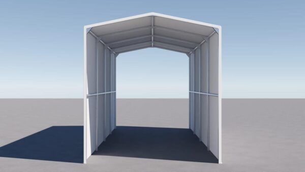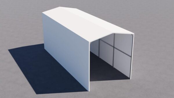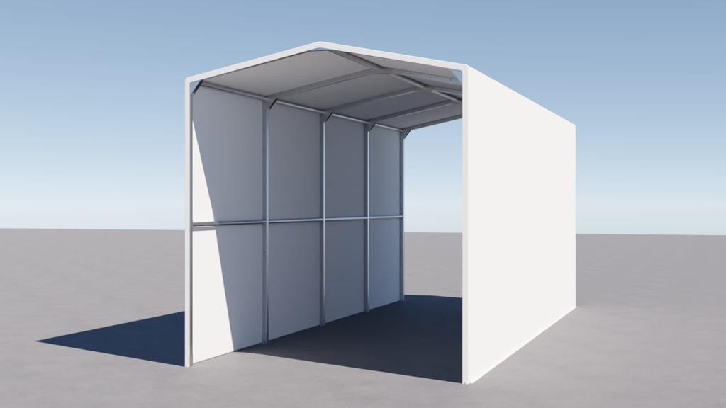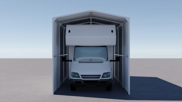 Struttura doppia falda studiata specificamente per il ricovero del camper realizzata a misura standard mm 8000X3200 H utile mm 3300, in acciaio zincato e con copertura tetto e pareti laterali in tessuto tecnico PVC ad alta resistenza.